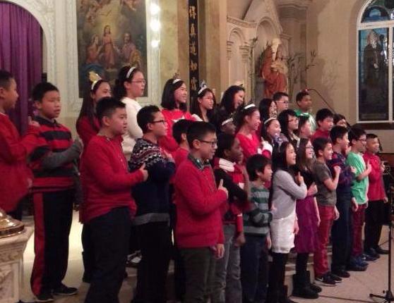 Pastor Fr. Francis Li, Teachers Mr. Thomas Howard and Mr. Jeff Chrusciel, and 6th graders celebrate the final Advent Liturgy of 2016 |