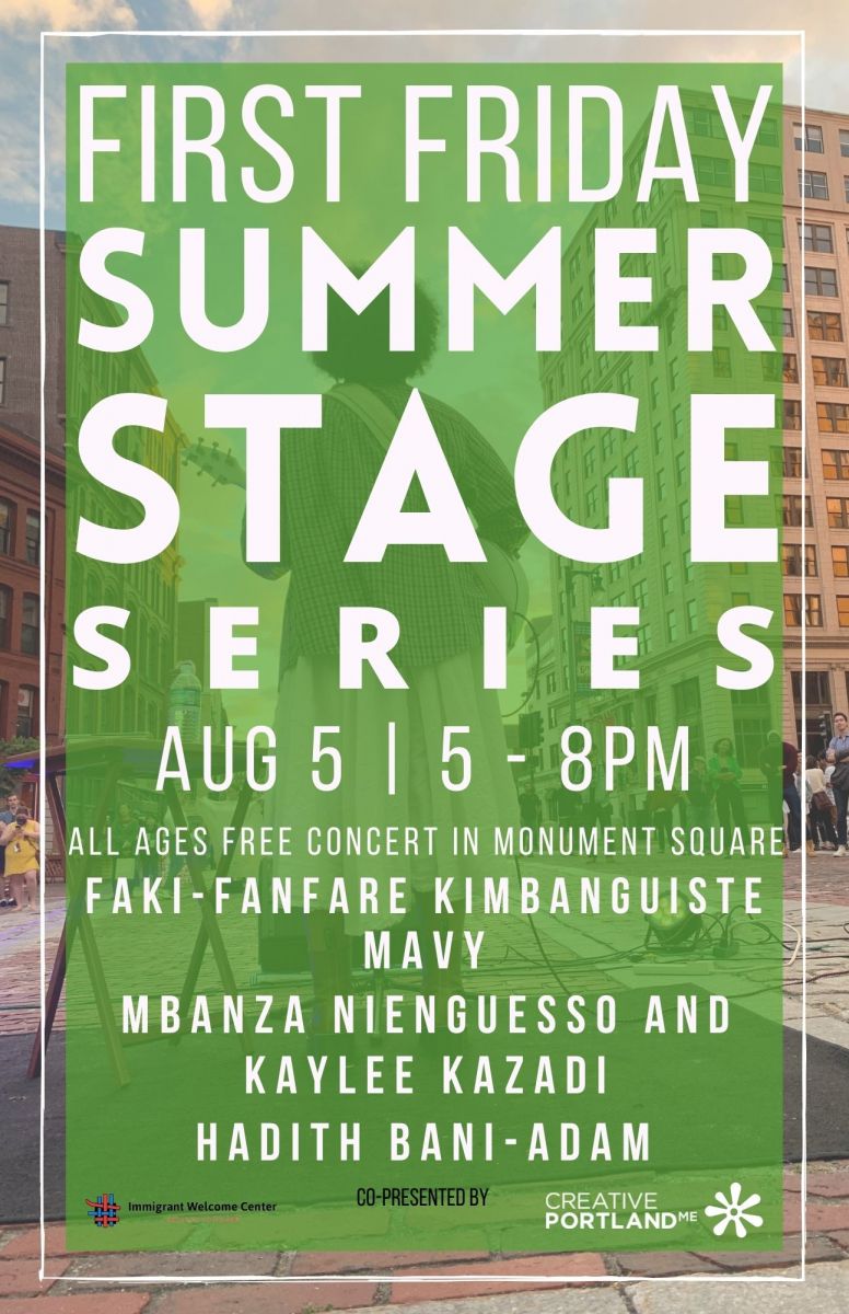 The second installation of New Mainers on Stage will take place in August! This month's performances will feature Kaylee Kazadi & Mbanza Gabriel Nienguesso, FAKI- Fanfare Kimbanguiste, Mavy, and Hadith Bani-Adam. Thank you to our co-sponsors, Creative Portland, and the Onion Foundation.