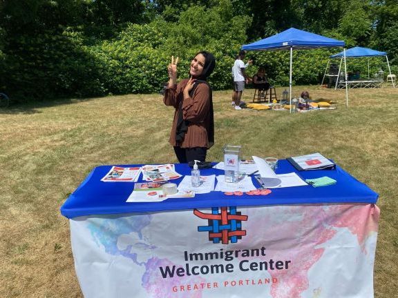 For the past few months, we have been introducing new initiatives. These include a Food Security and Healthy Diet Project; New Mainers On Stage, offering a series of outdoor concerts to bring performances by artists of color to immigrant audiences at no cost; and free, in-person English classes at sites that are easy to access for parents with young children interested to improve their language skills. Similarly, we have organized community events, such as Soccer Saturday, where soccer balls, books, and healthy snacks were given away, summer concerts at the Congress Square Plaza, and a World Refugee Day celebration. Our staff has tabled during the Eid celebration at the EXPO, giving away books, toys, and games, and at the Eid al-Adha celebration in Biddeford.