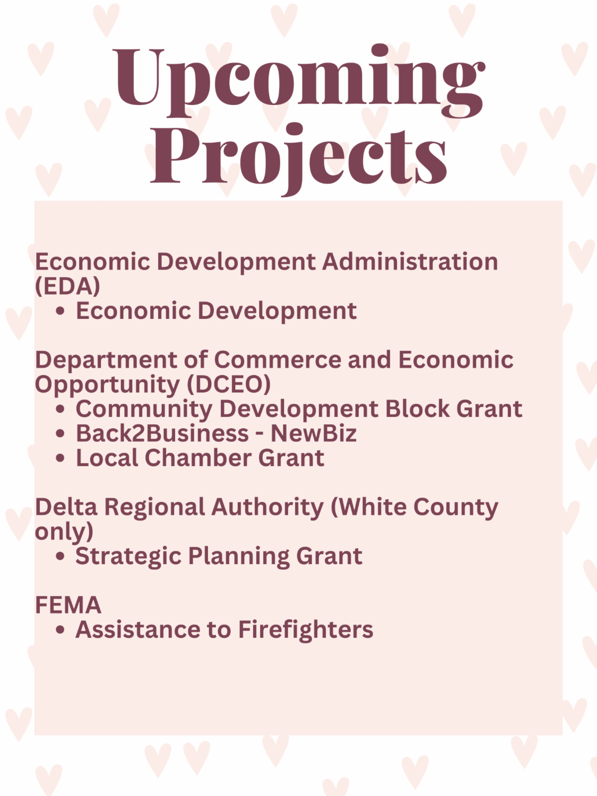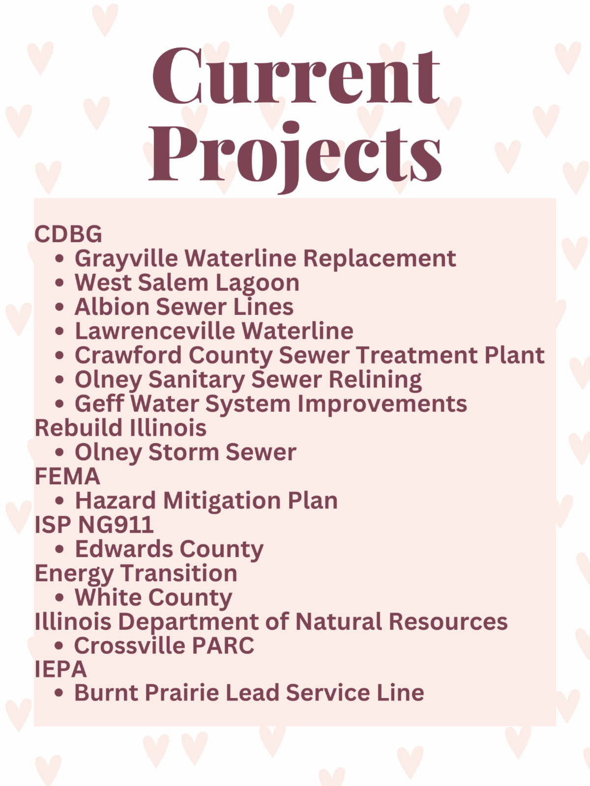 In order to submit a CDBG grant, the applicant must meet these criteria. Without this information, an application cannot be completed. We recommend planning for applications a year in advance to make sure the application will be completed on time. Applications were submitted this cycle for Albion, Grayville, Bridgeport, and Noble. The application process can be lengthy, so we recommend that planning a year in advance. Contact Jeff Vaughan or Mike Gill so we can get started on those applications!