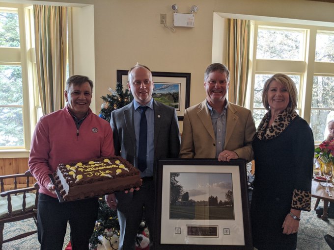 John Gall, 3rd from left, retiring after 40 years, receives a cake and photo of the course he maintained for 12 years at Cherry Hill. Congratulations John.