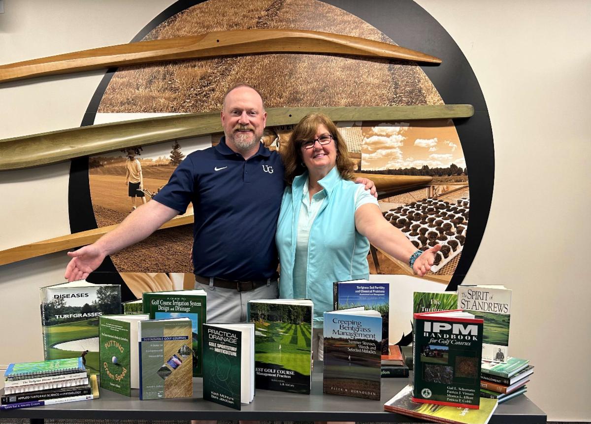 Marie Thorne, a pioneer of women in the turf industry has passed her turf industry book collection to the University of Guelph Turf Management programs. Pictured here with Cam Shaw.