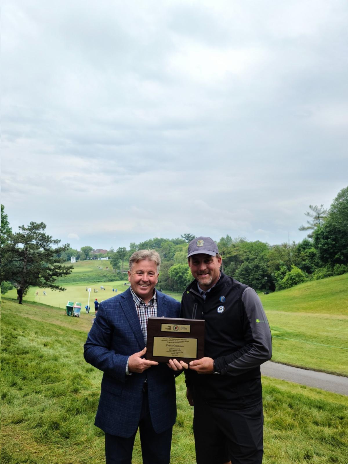 CGSA Vice-President John McLinden, AGS, right presents Patrick Greenman with his National Tournament plaque during the RBC Canadian Open.