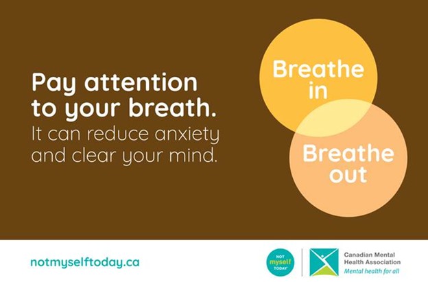 | | Paying attention to your breath can promote relaxation, mental clarity, and emotional stability by helping calm the nervous system and reduce stress. Click Mindful Moments Quick Reference Cards, shared from our CMHA NotMyselfToday program, provides basic instructions on the awareness of breath practice and additional resources. | |