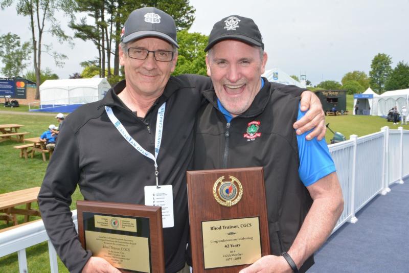 CGSA member and 2018 CGSA/Bayer Superintendent of the Year, Dean Baker is presenting best friend Rhod Trainor, CGCS, Superintendent at the Hamilton Golf & Country Club with his CGSA National Tournament plaque for hosting the RBC Canadian Open as well as Rhod's 42-year member recognition plaque during Rhod's retirement party which took place on June 4th at the HG&CC.