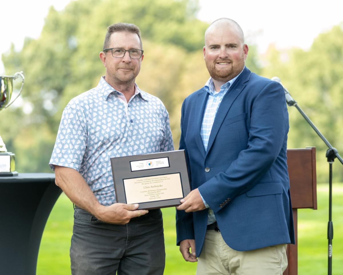 Chris Andrejicka (left), receives his National Tournament plaque from Greg Brown during the Canadian All Abilities Championship, presented by BDO. Photo courtesy of Golf Canada.