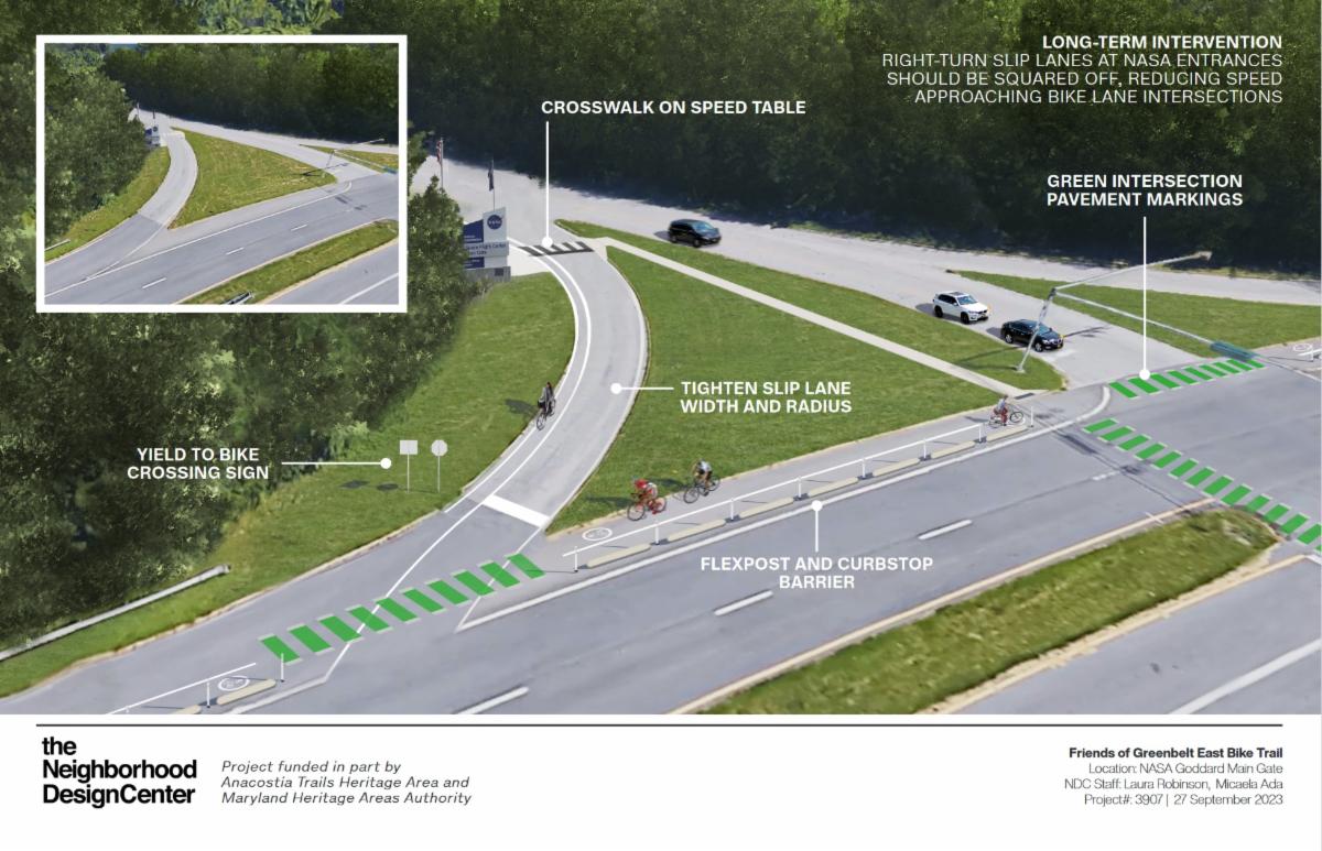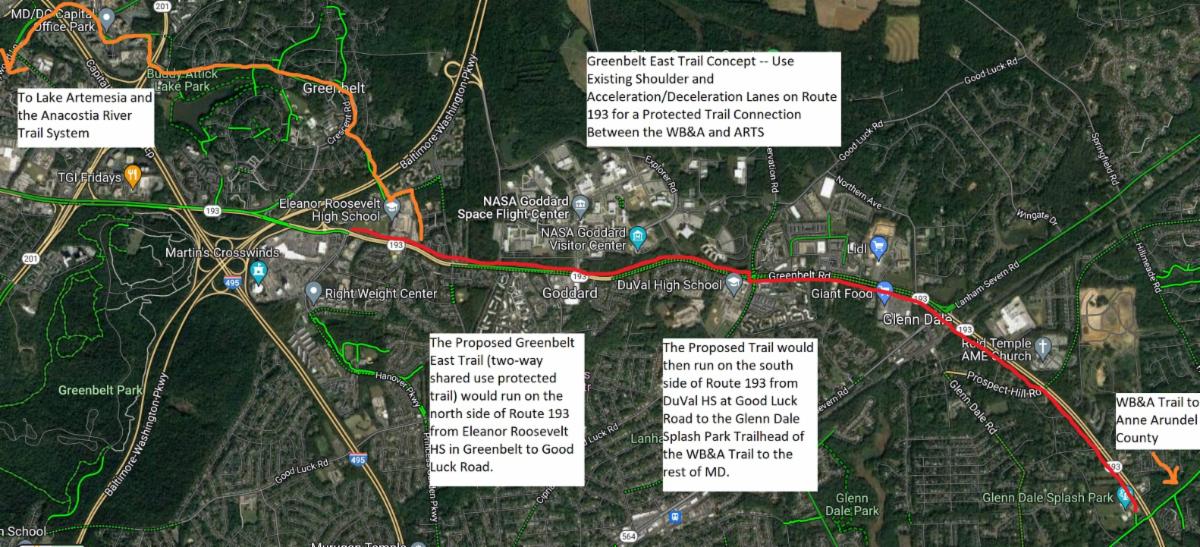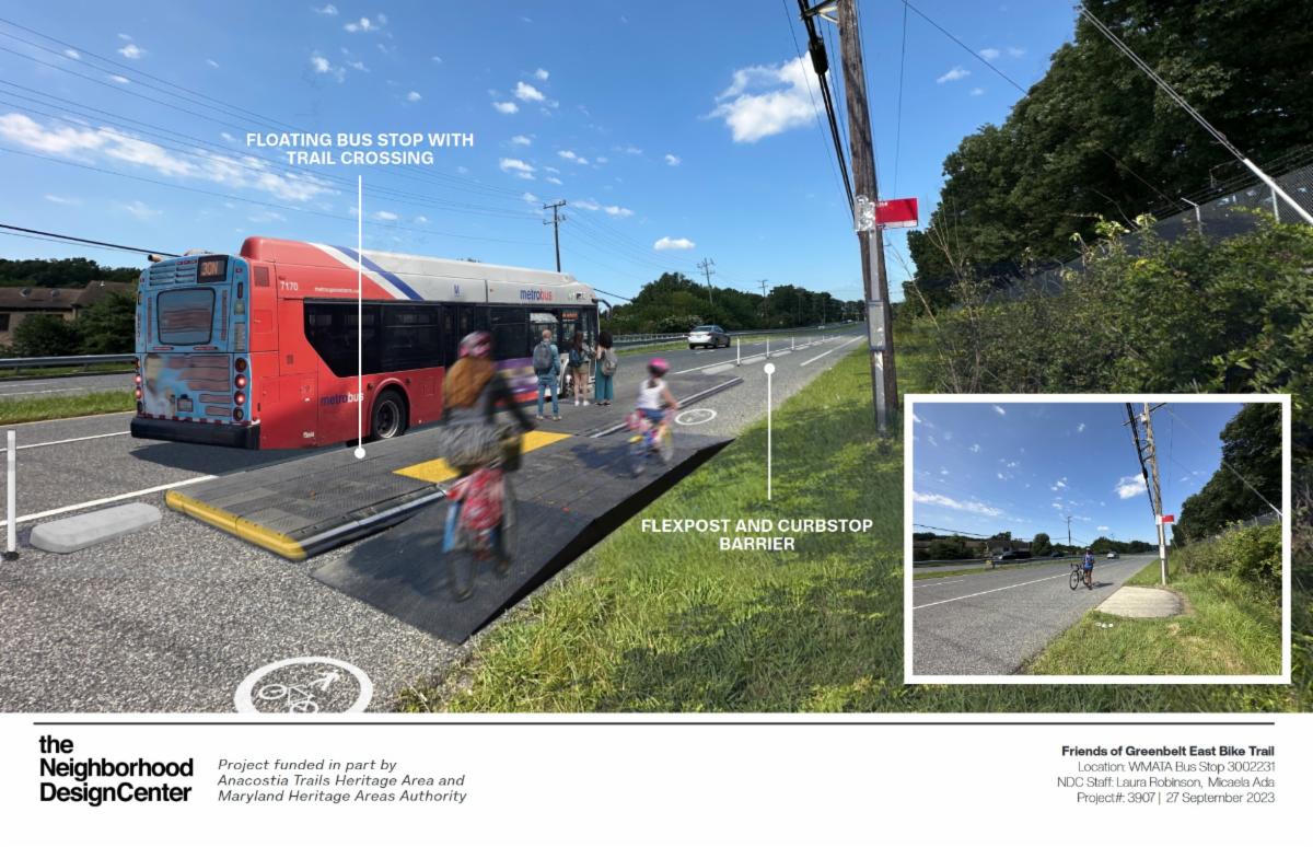 - The bad news is I also learned that the Greenbelt East Trail was turned down for a "quick build" option for the section in front of NASA -- essentially adding those curbstops and flexposts right away -- because of concerns that buses stopping to pick up passengers would sink in to the asphalt unless new concrete bus pads were added.