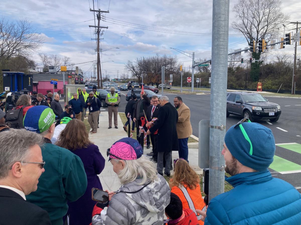 That rendering just above was from 2016, when WABA's Prince George's Action Committee first launched our campaign to fully connect the Hyattsville trolley trail with the Anacostia River Trails via a sidepath alongside Route 1. I don't recall the exact date, but I know it preceded our trail walk with then-Senator Paul Pinsky, which was in August 2016. So it has been at least 7 years from the start of that campaign to the ribbon cutting.