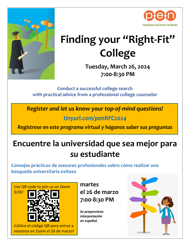 PEN will be presenting the virtual program "Finding Your Right-Fit College" on Tuesday, March 26. We've shared the info with the high school principals, but if you could also help get the word out, that would be great! Below are blurbs in English and Spanish; there's also a flyer (pdf) attached.