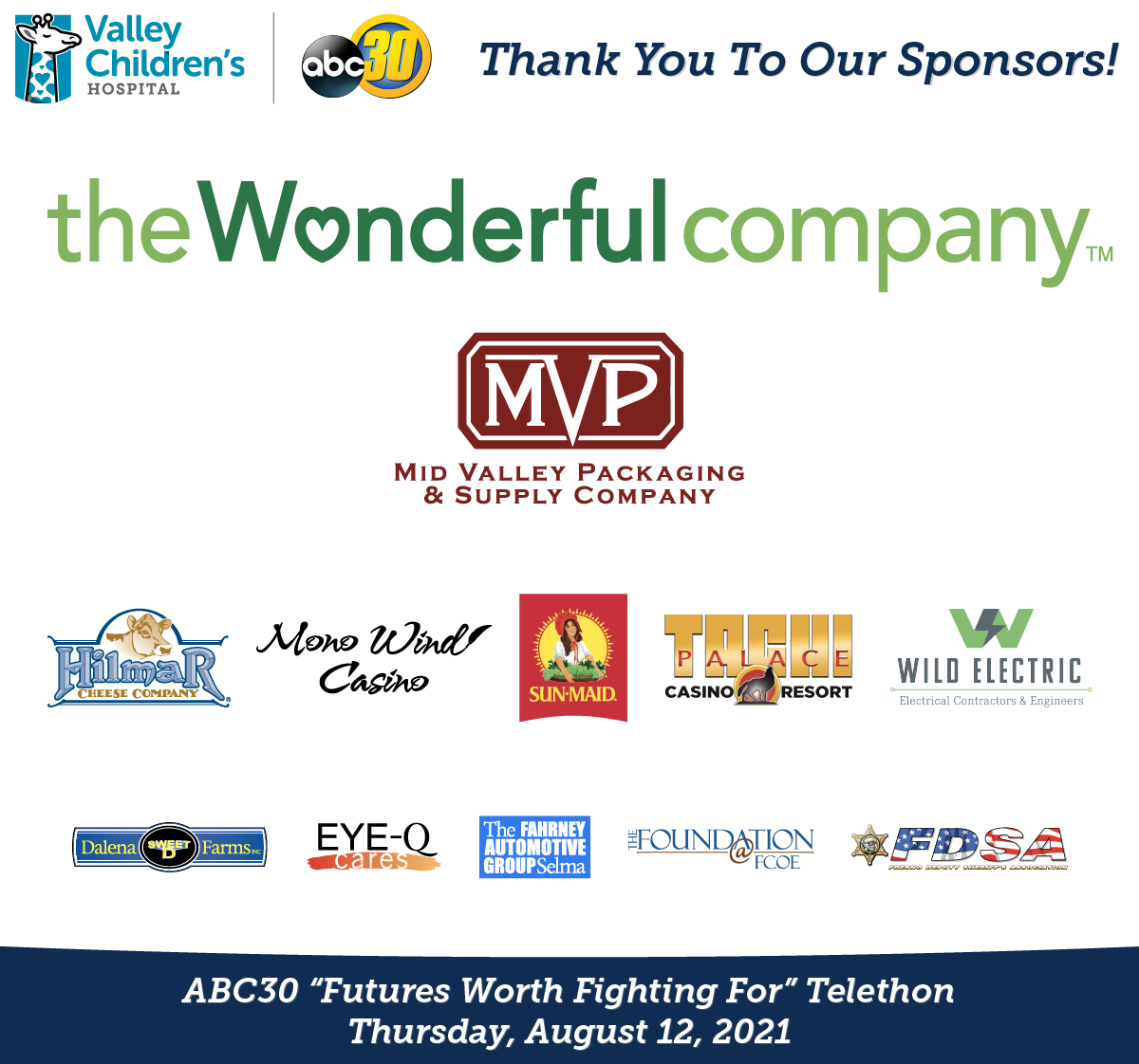 Valley Children's 7th Annual ABC30 "Futures Worth Fighting For" Telethon is coming up on Thursday, August 12, 2021. For an entire day, ABC30 will be sharing about the services and care Valley Children's provides for the children in our community. We want to express a special thank you to our sponsors for this event.