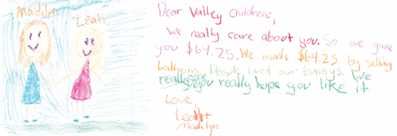 We received a very generous donation from Leah and Madilyn. The two girls made and sold balloon animals to benefit Valley Children's and raised $64. We are so grateful to both girls for their hard work to help support the ill and injured children served at Valley Children's. Below is a copy of the letter that accompanied their donation.