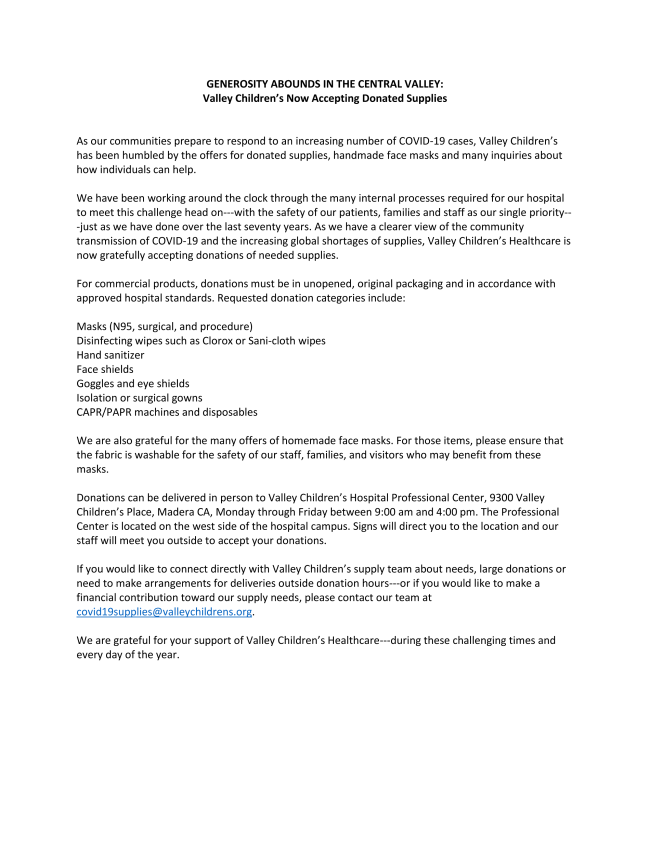 As our community prepares to respond to an increasing number of COVID-19 cases, Valley Children’s has been humbled by the offers for donated supplies, handmade face masks and many inquiries about how individuals can help.