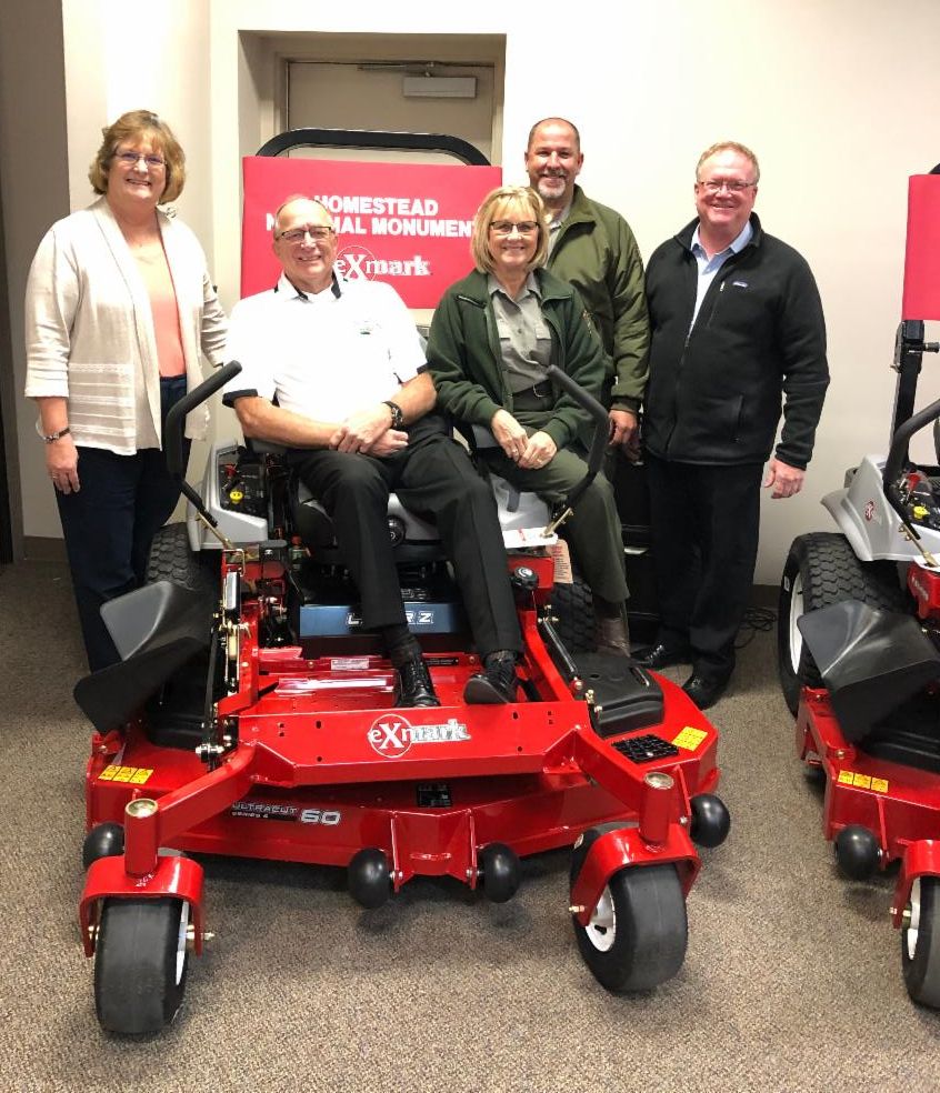 Tammy Weers and Don Ferneding, both with the Friends of Homestead, invite Homestead employees Sue Bruns, Travis Allen, and Mark Engler to join them in the photographs showing off Homestead National Monument of America's new Lazer Z Mower