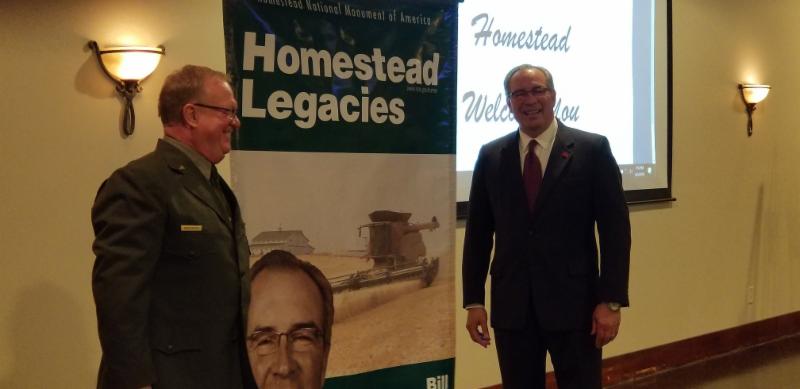 Photo: Homestead National Monument of America Superintendent Mark Engler with Bill Moos at the Homestead Legacy Banner unveiling.