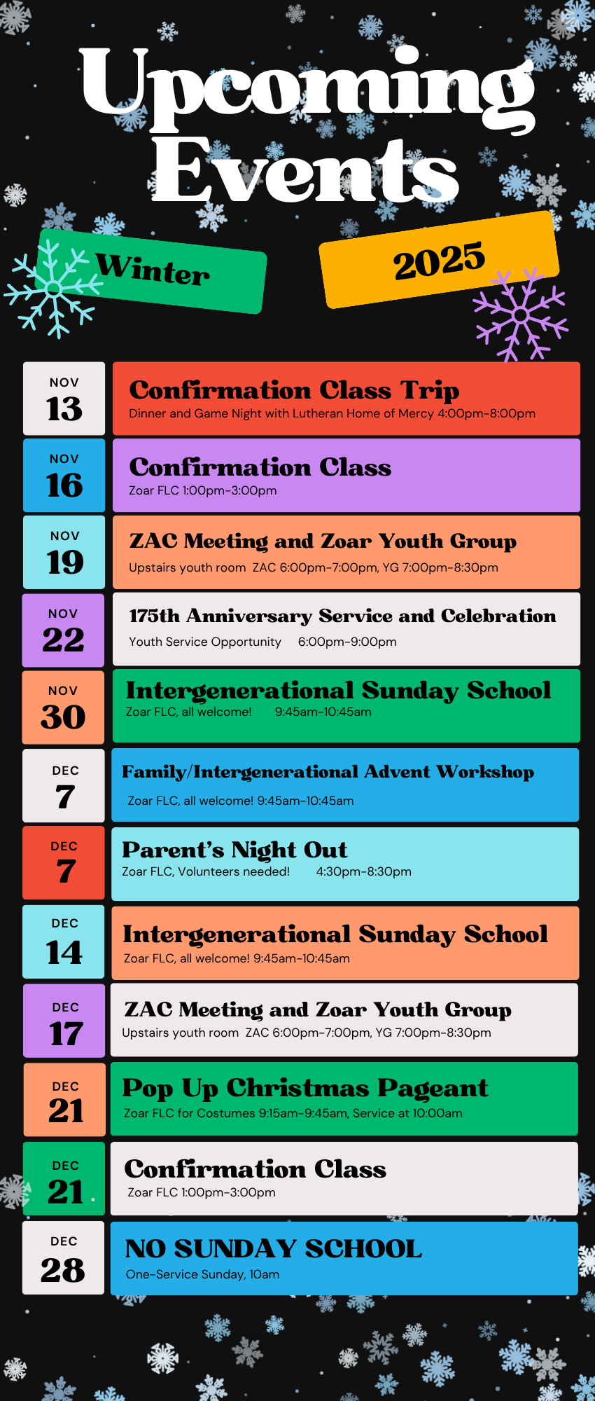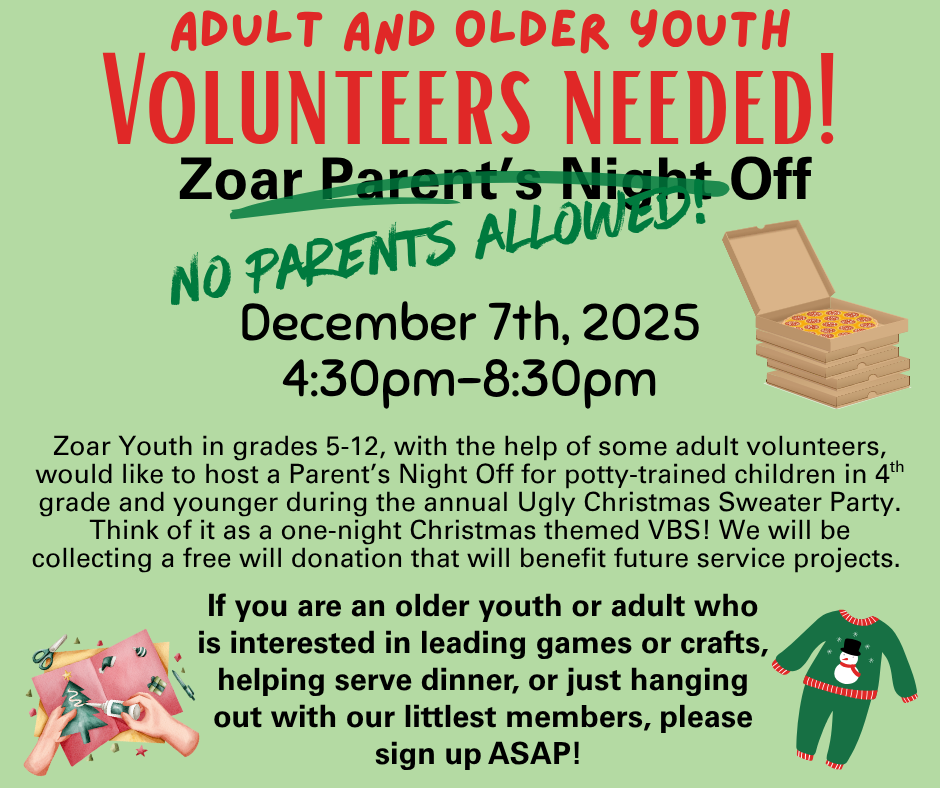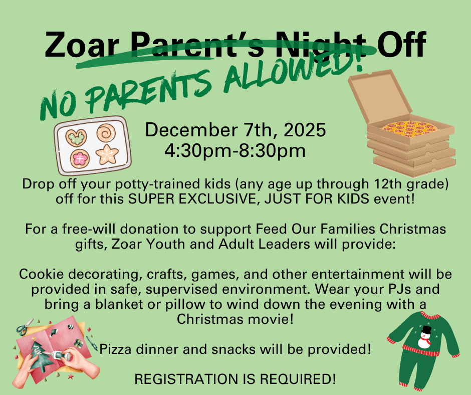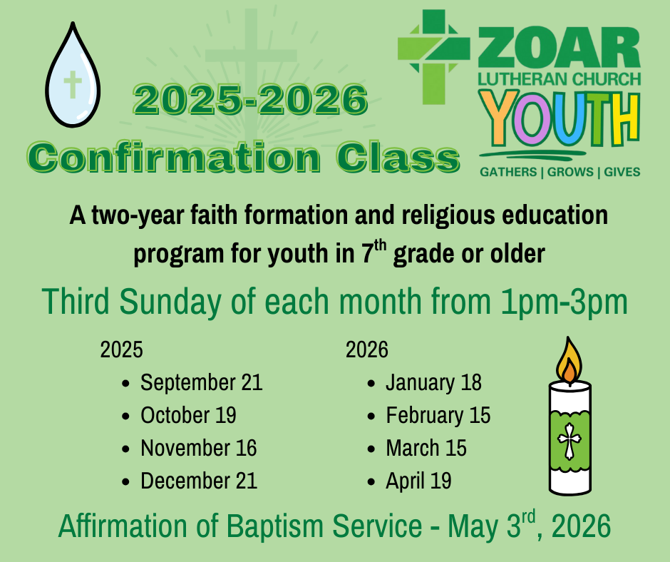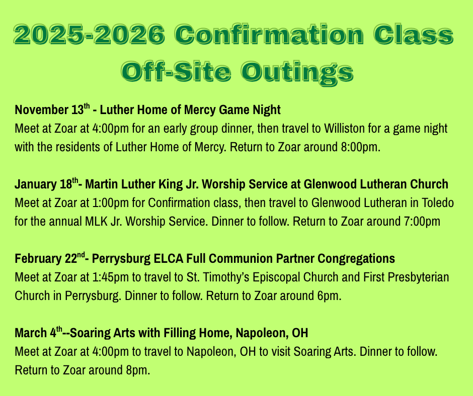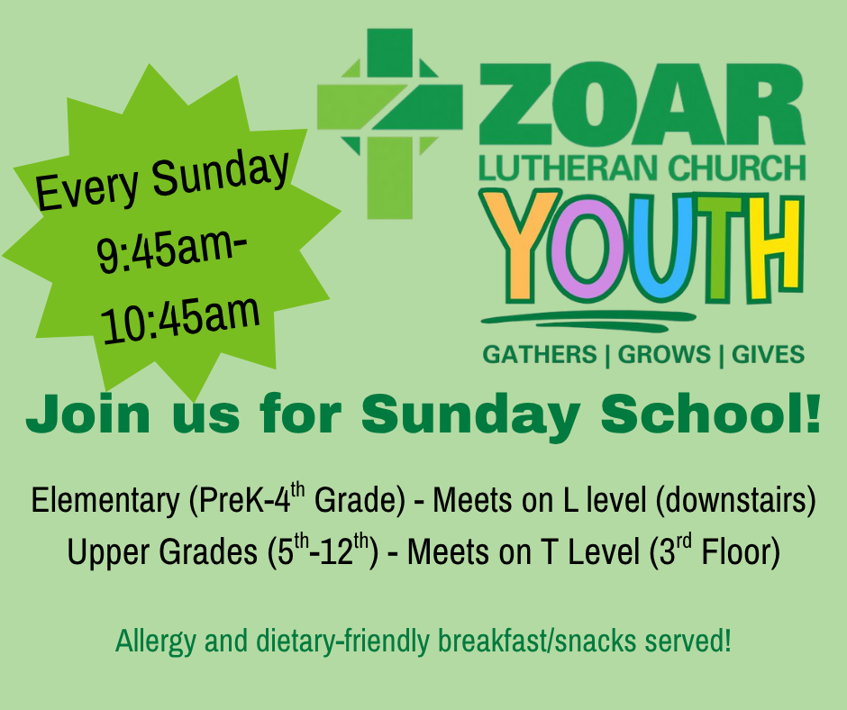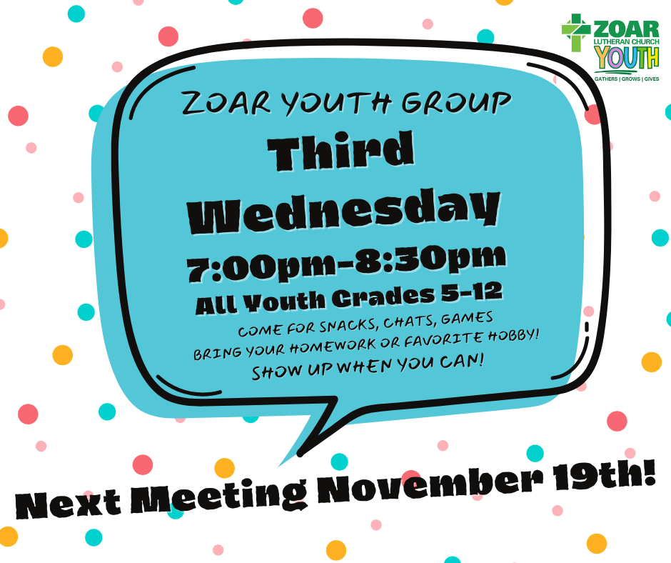 It's been a great year so far as we've started up Sunday School, youth group, Confirmation, and other Youth Ministry Programming! If you are interested in being a part of any of our programs, please make sure you register your youth and review the other sign ups carefully so you aren't missing any of the fun, faith, and fellowship we have in store for Zoar Youth this winter! |
