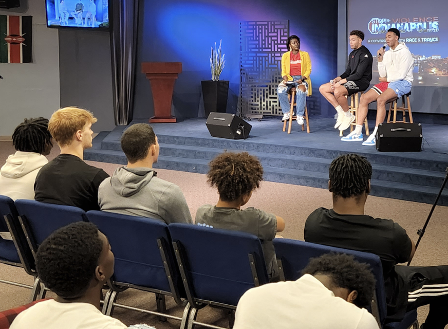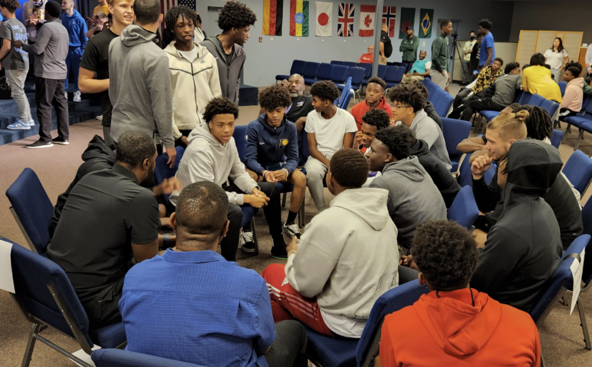 UNITE INDY partner Stop the Violence Indianapolis (SVI) brought in two Indiana basketball stars, Trayce Jackson-Davis and Race Thompson, to lead an event for basketball players from Indianapolis area high schools to discuss teen gun violence here. The event, produced by Anthony Beverly of SVI in conjunction with Hoosiers for Good, encouraged these students to use the influence they possess to change the narrative in their schools and neighborhoods.