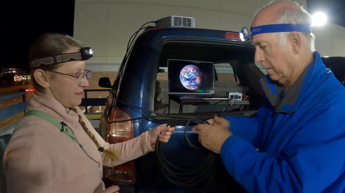 Above: GrowthBusters Ally Richardson and Dave Gardner hook up projector for trial run in downtown Colorado Springs