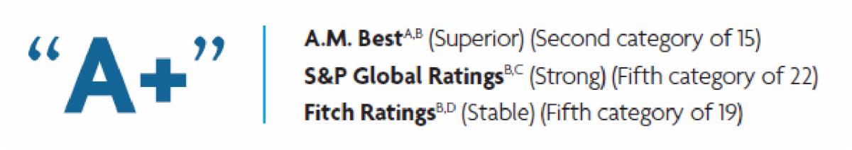 A.M. Best is a large third-party independent reporting and rating company that rates an insurance company on the basis of the company’s financial strength, operating performance, and ability to meet its obligations to policyholders. S&P Global Ratings is an independent, third-party rating firm that rates on the basis of financial strength. Fitch Ratings is a global leader in financial information services and credit ratings. Ratings shown reflect the opinions of the rating agencies and are not implied warranties of the company’s ability to meet its financial obligations. The above ratings apply to Midland National’s financial strength and claims-paying ability. A) A.M. Best rating affirmed on July 30, 2021.