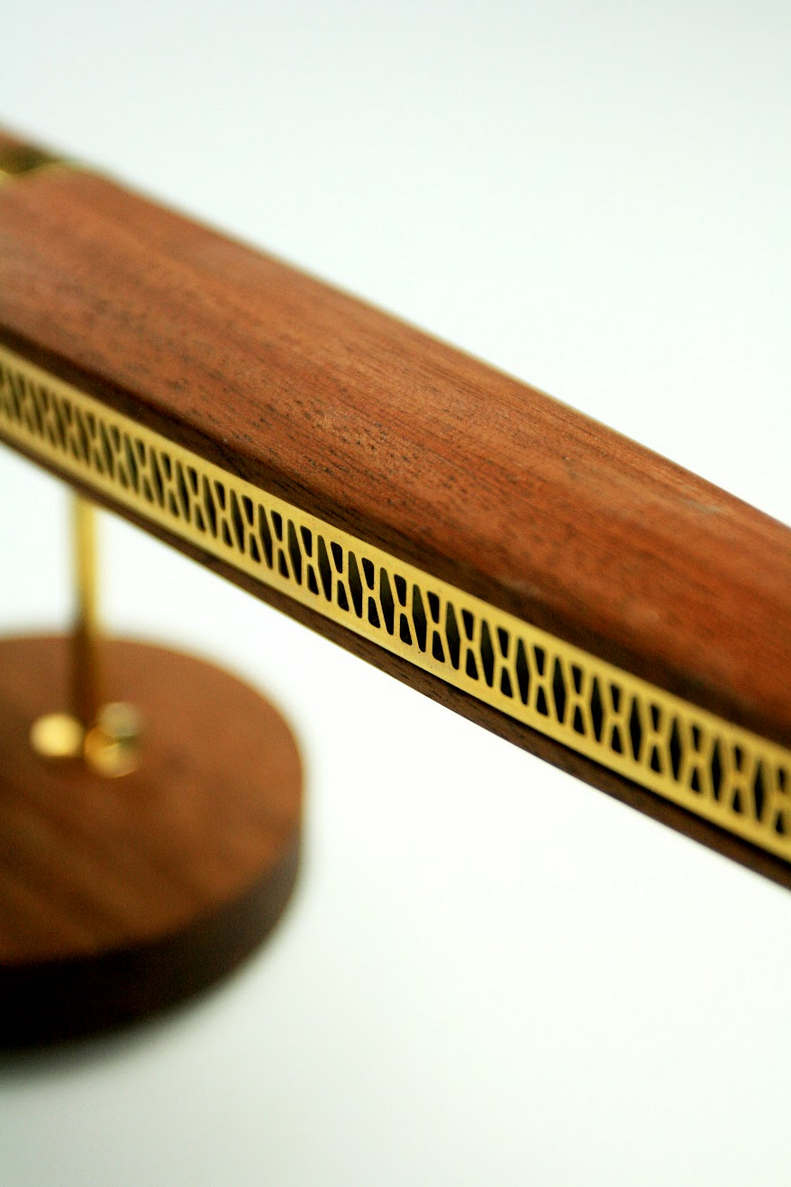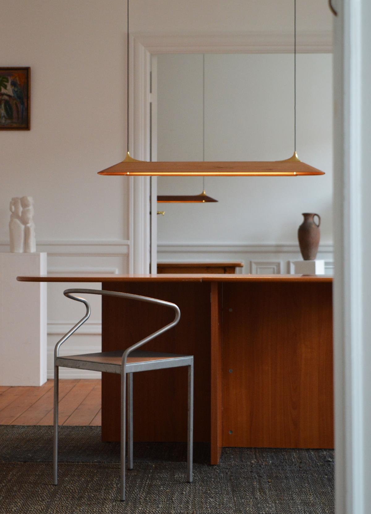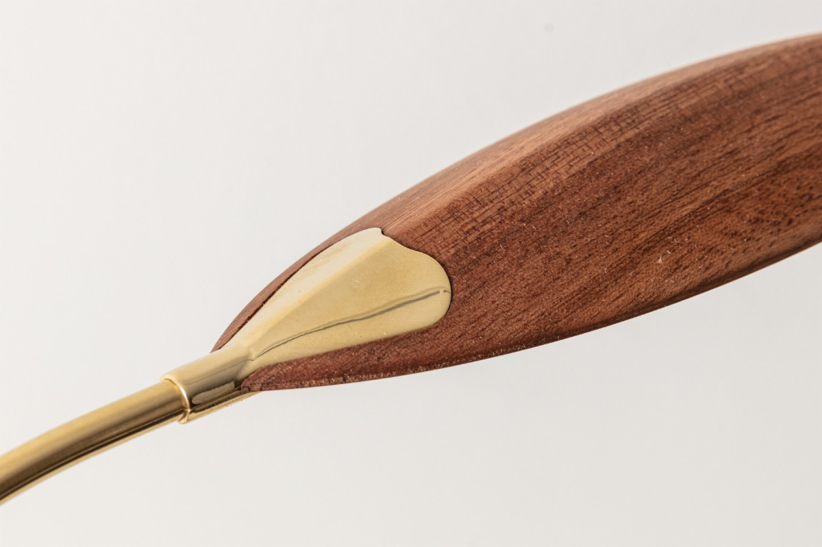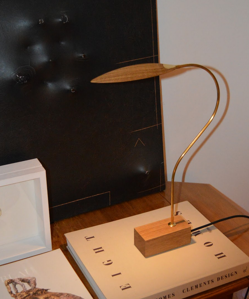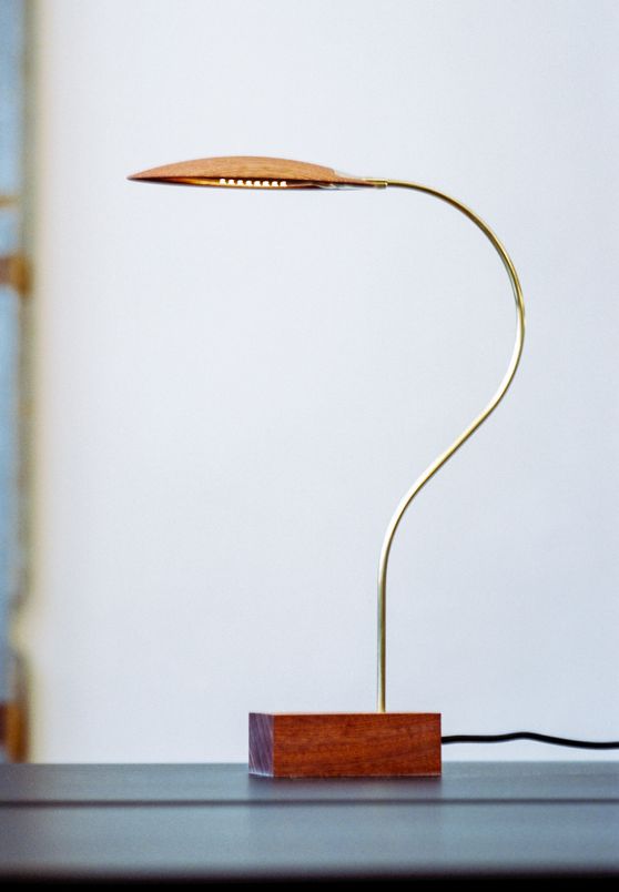 SENSUAL AND SCULPTURAL, MERNOE'S NO. 2 DESK LAMP IS A FUSION OF GEOMETRIC AND ORGANIC SHAPES. ITS LEAF-LIKE WARM WOOD SHADE IS SUPPORTED BY A TENDERLY CURVED METAL PIPE, AND IS PRESENTED ON A HAND FINISHED CUBIC WOOD BASE.