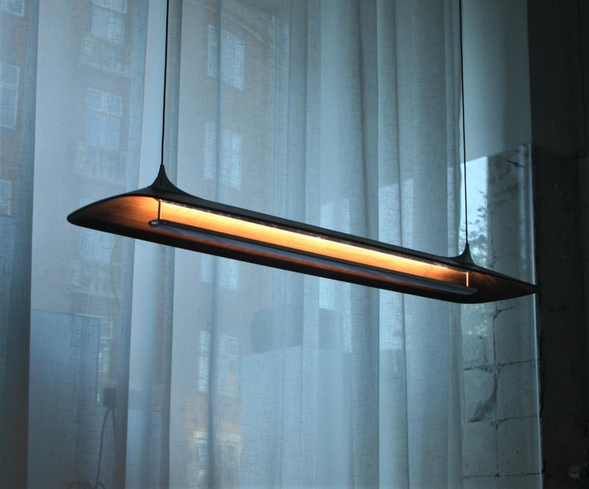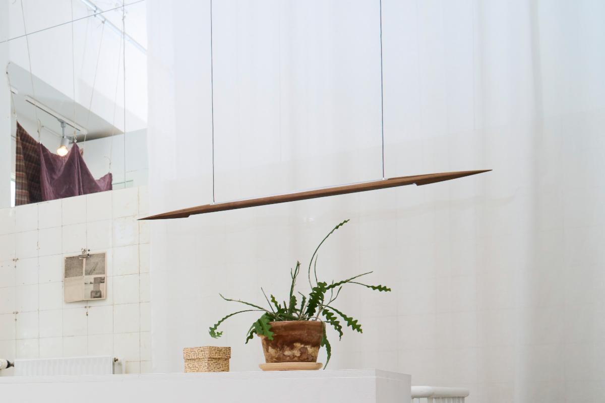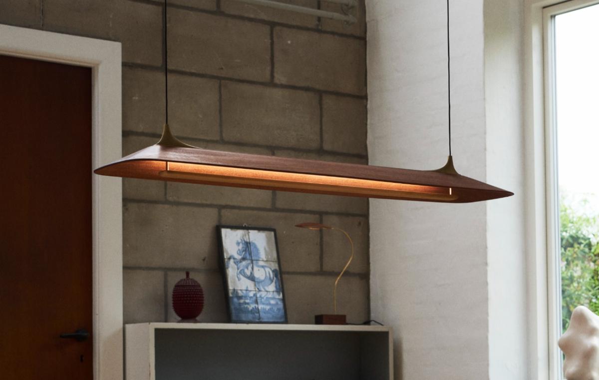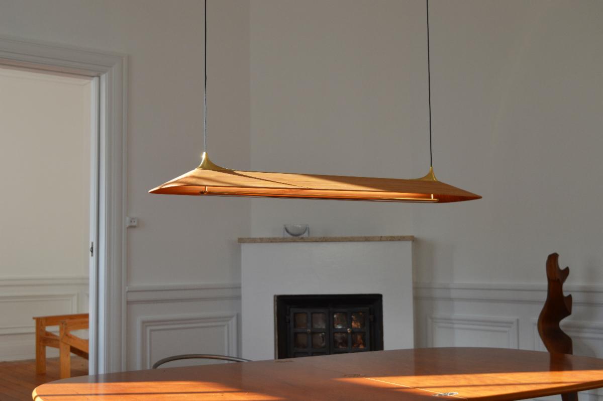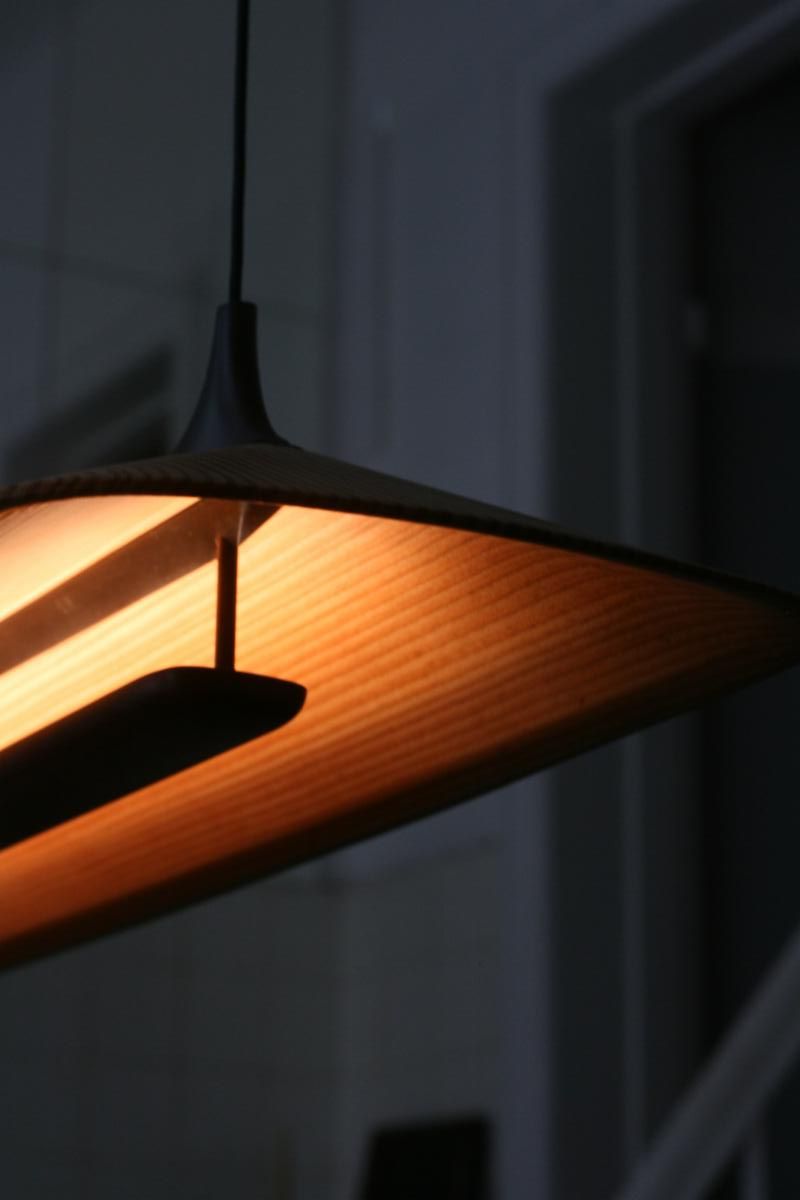 SENSUAL AND SCULPTURAL, MERNOE'S NO. 2 DESK LAMP IS A FUSION OF GEOMETRIC AND ORGANIC SHAPES. ITS LEAF-LIKE WARM WOOD SHADE IS SUPPORTED BY A TENDERLY CURVED METAL PIPE, AND IS PRESENTED ON A HAND FINISHED CUBIC WOOD BASE.