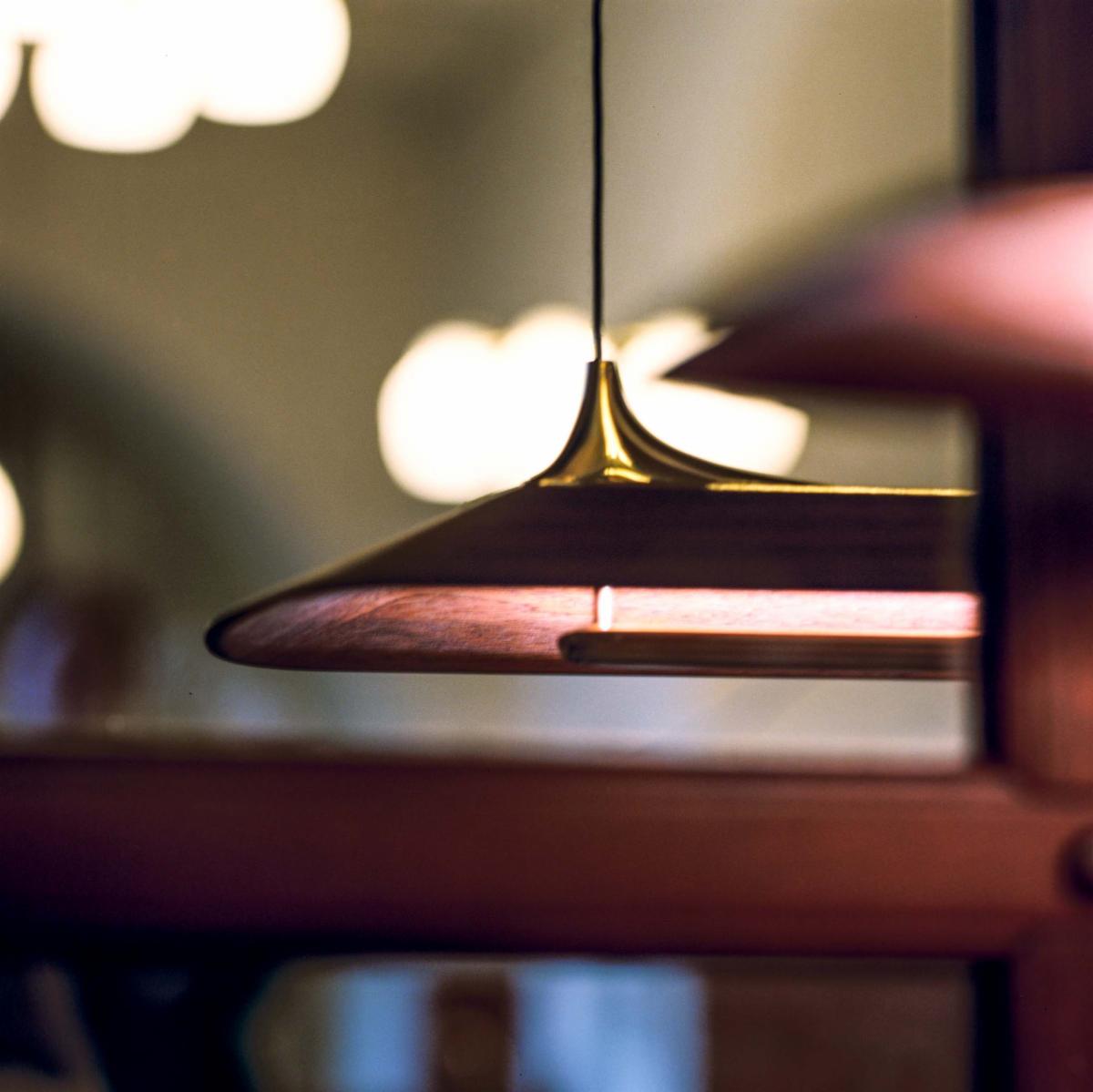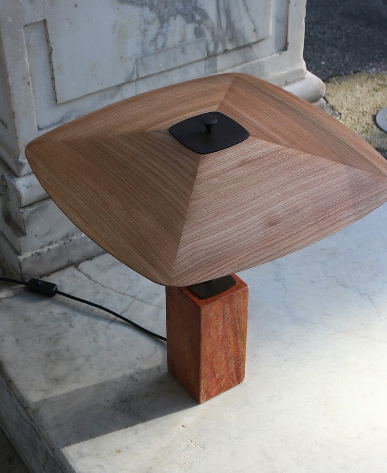 BROODING YET NATURAL, MERNOE'S NO. 5 TABLE LAMP IS A HANDCRAFTED COMBINATION OF WARM WOODS, TRAVERTINE, AND BRASS METALWORK. LIGHT EMITTED FROM AN LED SOURCE IS ELEGANTLY REFLECTED OFF OF THE CURVED UNDERSIDE OF THE WOOD SHADE, BATHING THE SPACE AROUND THE LIGHT IN A WARM AMBIENT GLOW.