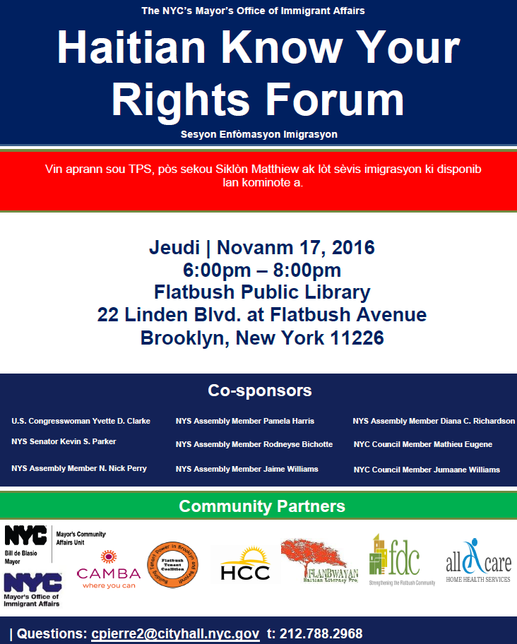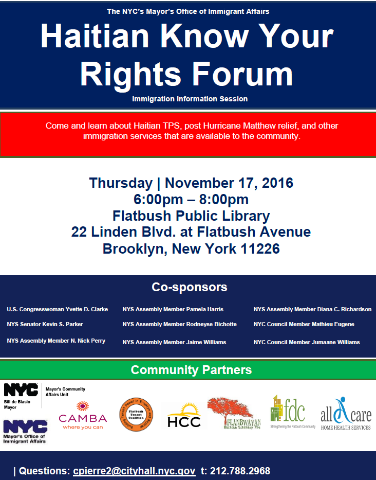Mayor's Office of Immigrant Affairs will host the "Haitian Know Your Rights Forum," an information session where attendees can learn about Temporary Protected Status (TPS) and immigration services available to the Haitian community. Attendees will also be able to learn about post Hurricane Matthew relief efforts.