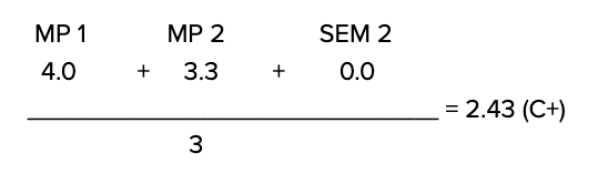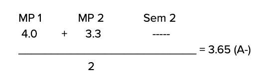 A student earned an A in the first marking period and a B+ in the second marking period. For the second semester, the student earned a P (Passing Grade). The student’s final grade is the average of the first two marking periods: 4.0 + 3.3 = 3.65. Therefore, the student’s final grade is an A-.