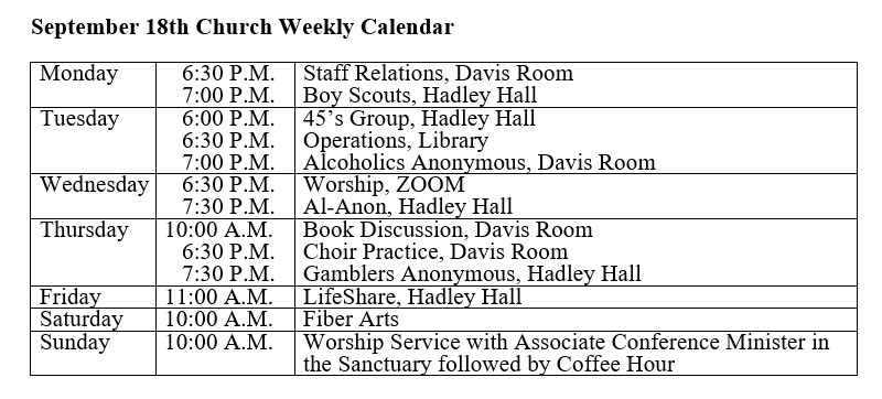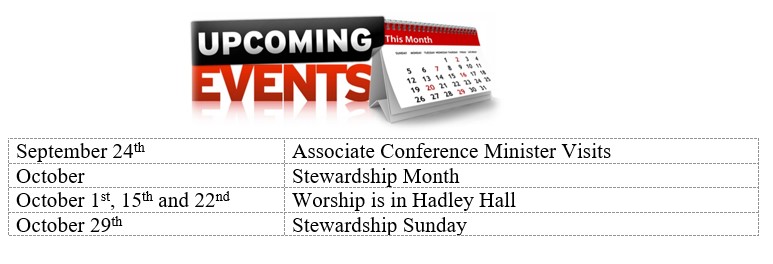 On Sunday, September 24th we are happy to welcome the NH UCC Associate Conference Minister Reverend Sara Marean. Rev. Sara will preach as well as host a Q & A after the service about the NH Conference and wider church. Please join us for this special occasion.