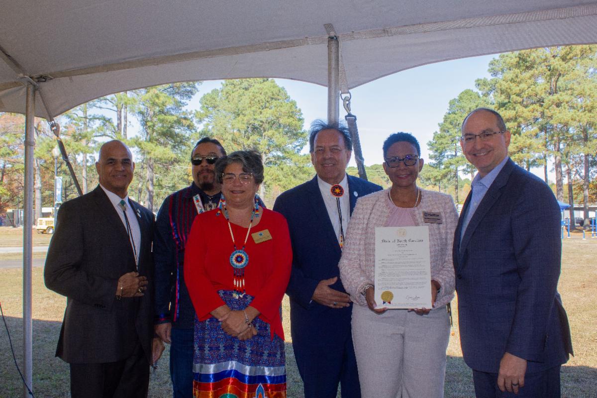 | | HCC Hosts 17th Annual Native American Heritage Month Celebration | Left to right: Mr. Tony Brown, HCC Board of Trustees; Mr. Earl Evans, Vice Chairman, Haliwa Saponi Tribal Council & Co-Chair of the National Congress of American Indians Federal Acknowledgement Task Force; Ms. Chenoa Richardson-Davis, Vice Chairwoman, Halifax County Board of Commissioners; Mr. Greg Richardson, Executive Director, NC Commission of Indian Affairs; Dr. Patrena Elliott, President of Halifax Community College; and Mr. Gabriel Esparza, Secretary of the NC Department of Administration | |