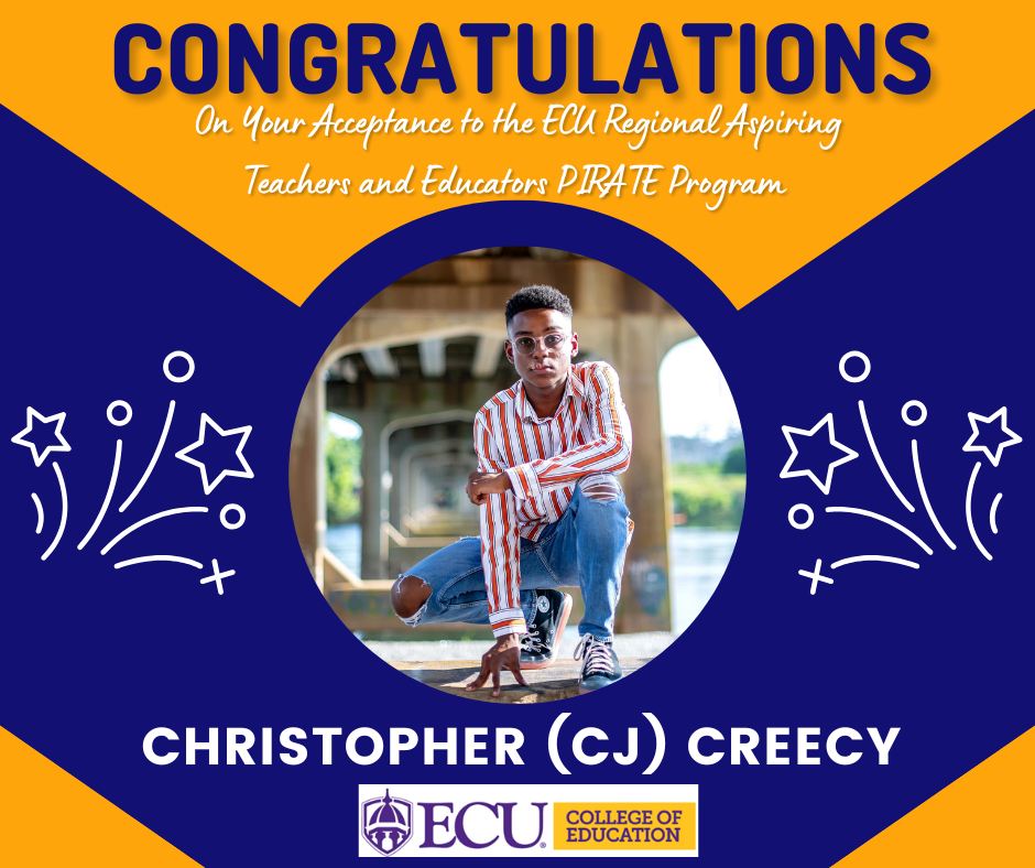 Congratulations to Christopher (CJ) Creecy, a junior at Northampton County Early College, on his acceptance into the East Carolina University Pirate Institute for Regional Aspiring Teachers and Educators (PIRATE) program!