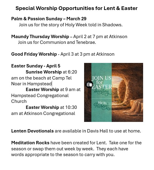 In the United Church of Christ, One Great Hour of Sharing is one of the 5 special offerings of the church. It supports partners worldwide with ministries that fund health, education, and agricultural development, emergency relief, refugee ministries, and both international and domestic disaster response. Thank you for your support of this offering!