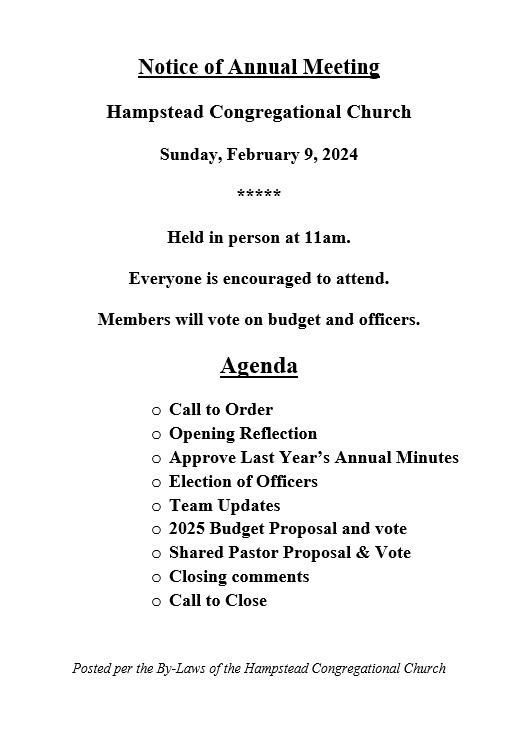 Want to get the word out about what’s happening at HCC? If you want to publicize your event or remind the congregation about something, please email the office (hcc1752@gmail.com) by Wednesday at noon so that your information can be included in that week’s Weekly Word. Feel free to send in information up to three weeks in advance of an upcoming event. We want all of the congregation (not just the Team leaders) to be empowered to get the word out about all the activities that are happening at Hampstead Congregational Church!