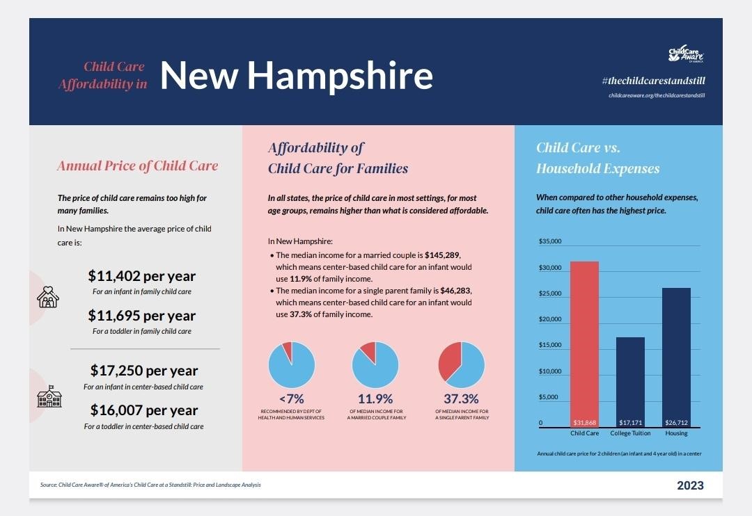 An article from the UNH Casey School of Public Policy reported that in 2023 the cost of childcare in New Hampshire for an infant and a 4-year-old surpassed $32,000 per year. That is equivalent to 28% of the median income for families with children under 5. The Department of Health and Human Services has a 7% standard for affordability. For the 7% standard to be met, a family would need an annual income of more than $455,000.