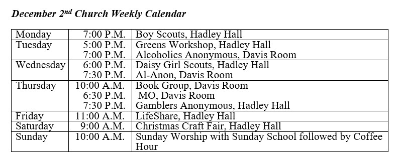 New and used copies of the book will be available for those who want it. It is also available digitally on Amazon. The schedule for our Advent Study will be: