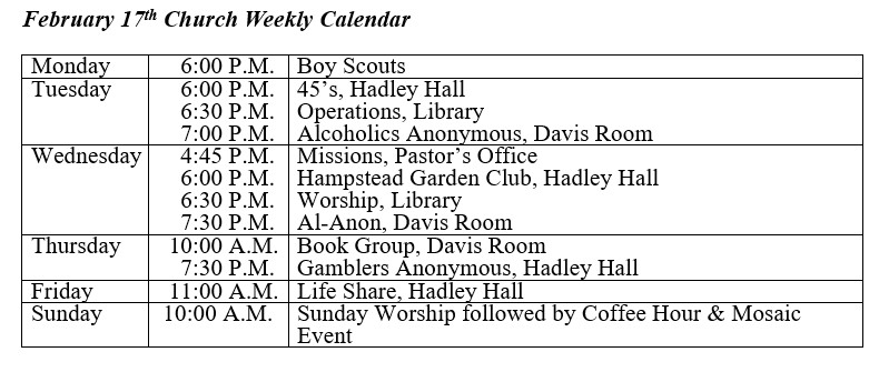 Weather allowing, Sunday worship will be held in Hadley Hall this week to make it easier to transition to our Annual Meeting.
