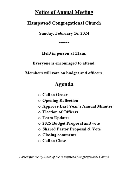 Want to get the word out about what’s happening at HCC? If you want to publicize your event or remind the congregation about something, please email the office (hcc1752@gmail.com) by Wednesday at noon so that your information can be included in that week’s Weekly Word. Feel free to send in information up to three weeks in advance of an upcoming event. We want all of the congregation (not just the Team leaders) to be empowered to get the word out about all the activities that are happening at Hampstead Congregational Church!