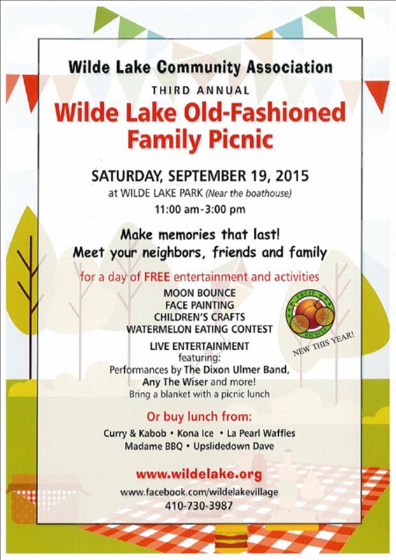 Wilde Lake Community Association is sponsoring the Third Annual Old-Fashioned Family Picnic on Saturday, September 19, 2015. The event, which is open to all residents and community members, will be held at Wilde Lake Park, Hyla Brook Road, from 11am-3pm. All are invited to join in with neighbors, friends and family for this fun-filled event featuring FREE activities including face painting for children, moon bounce with slide, children's crafts and watermelon eating contest. New this year will be neighborhood corn hole games!