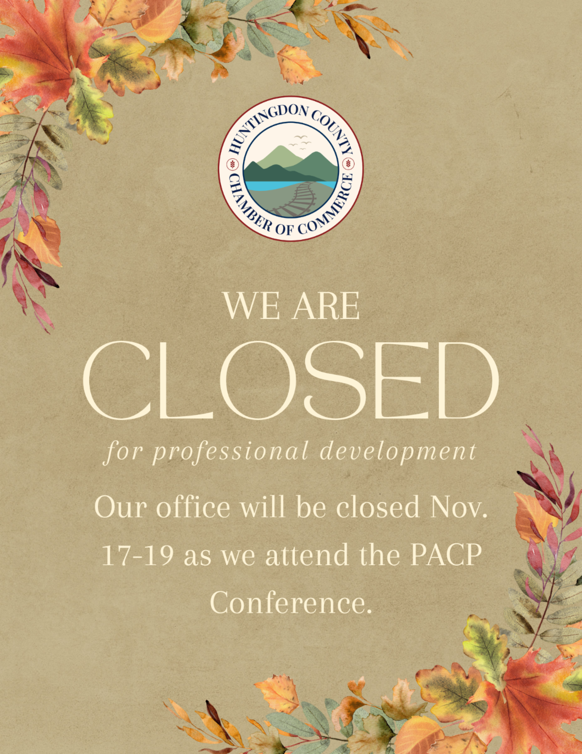 The Huntingdon County Chamber of Commerce office will be closed Monday, November 17th through Wednesday, November 19th as chamber staff travel to Seven Springs for the annual Pennsylvania Association of Chamber Professionals Leadership Conference. If you need to contact us during this time, please call and leave a voicemail or send us an email. Our access will be limited but we will get back to you as soon as we can. The chamber office will reopen at 9:00 a.m. on Thursday, November 20th. | | |