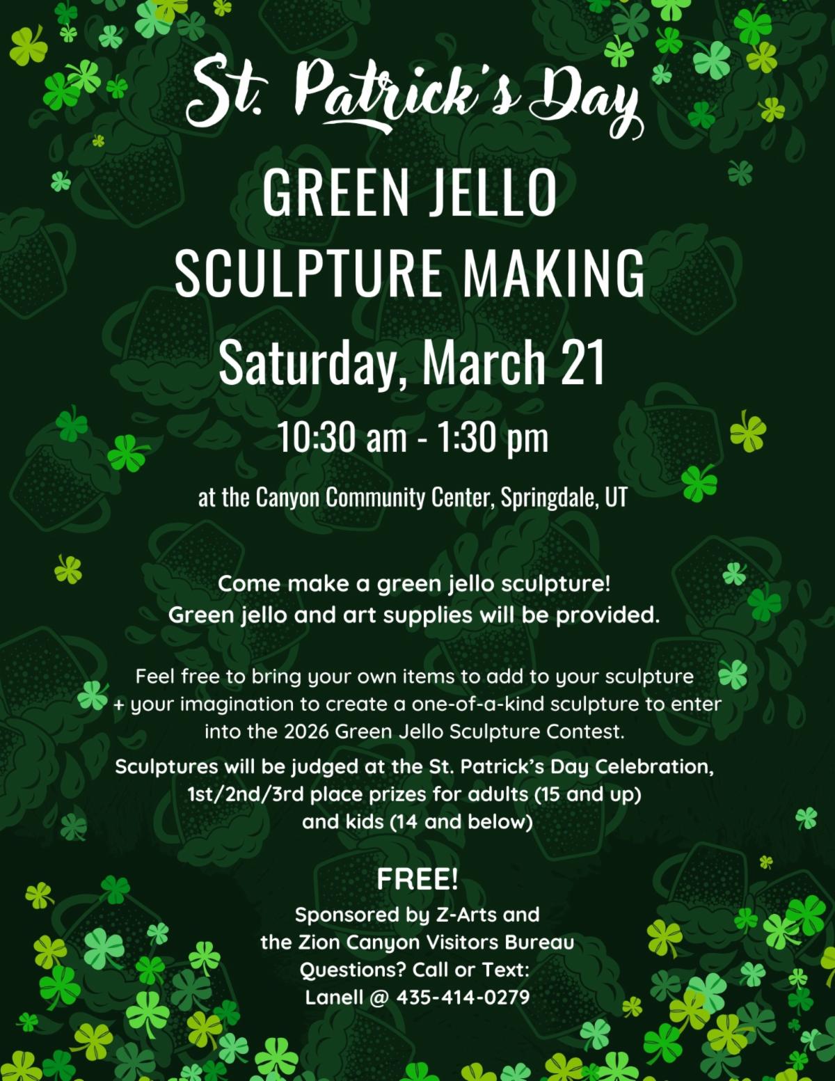 Join the Excitement: Z-Arts needs for Volunteers to help at the Green Jello Sculpture Contest as part of the St. Patrick's Day festivities! Saturday, March 21, 2026 - Noon to 4:30 p.m.