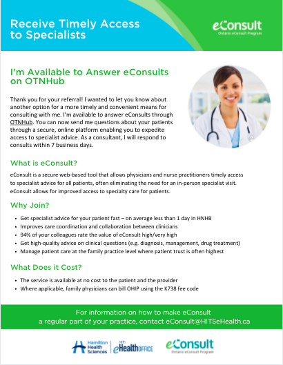 eConsult is a secure web-based tool, hosted on OTNHub, that allows physicians or nurse practitioners timely access to specialist advice for all long-term care residents, often eliminating the need for an in-person or virtual specialist visit. There is no cost for long-term care homes to use eConsult.