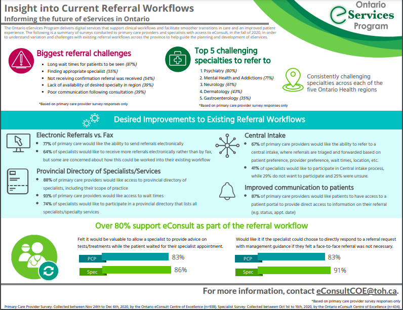 In 2018, an academic article was published in the Journal of the American Medical Director’s Association (JAMDA), demonstrating the feasibility of implementing eConsult in LTC settings.The complete paper is published for open access and is available here. An infographic highlighting the main findings of the study is available on the eConsult Centre of Excellence website here.