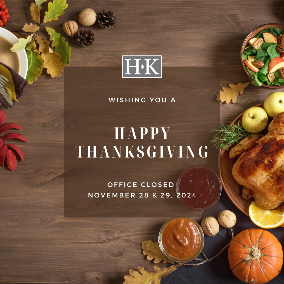 Please note that our office will be closed for the holiday and will reopen on December 2nd. On behalf of everyone at HK, we wish you a wonderful holiday weekend.