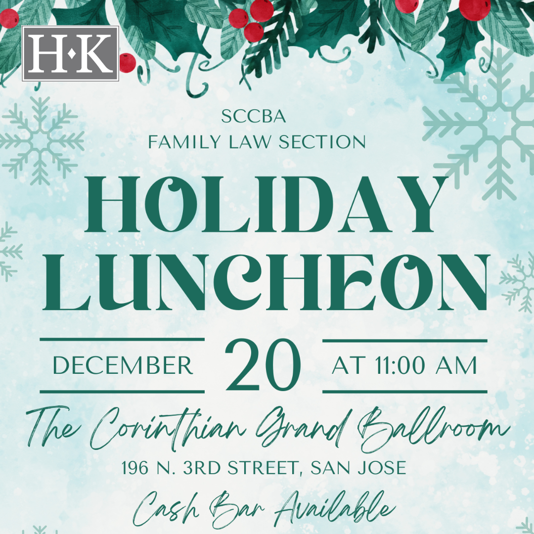 We are delighted to sponsor the Santa Clara County Bar Association (SCCBA) Family Law Section Holiday Luncheon on Friday, December 20, 2024! This festive event will take place from 11AM to 2PM at the elegant Grand Corinthian Ballroom in downtown San Jose. As a proud supporter of the SCCBA and its commitment to advancing the legal profession, we look forward to celebrating the holiday season alongside esteemed colleagues and friends in the family law community.