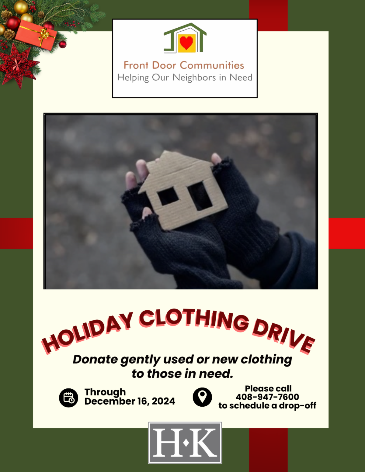 We invite our valued clients, referral partners, and friends to support Front Door Communities in downtown San Jose by contributing to our Clothing Drive from November 18 - December 13. This dedicated organization serves vulnerable individuals nutritious meals, essential resources, and the dignity of care as they work toward greater health and well-being.