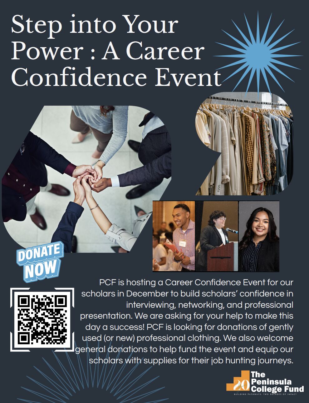 The Peninsula College Fund is hosting a Career Confidence Event on December 15, 2025, to help scholars build skills in interviewing, networking, and professional presentation. You can support them by donating new or gently used professional clothing at designated drop-off dates. PCF empowers first-generation, low-income students in the Mid-Peninsula and San Mateo/Santa Clara Counties with scholarships, mentoring, and career support, helping them graduate career-ready and debt-free.