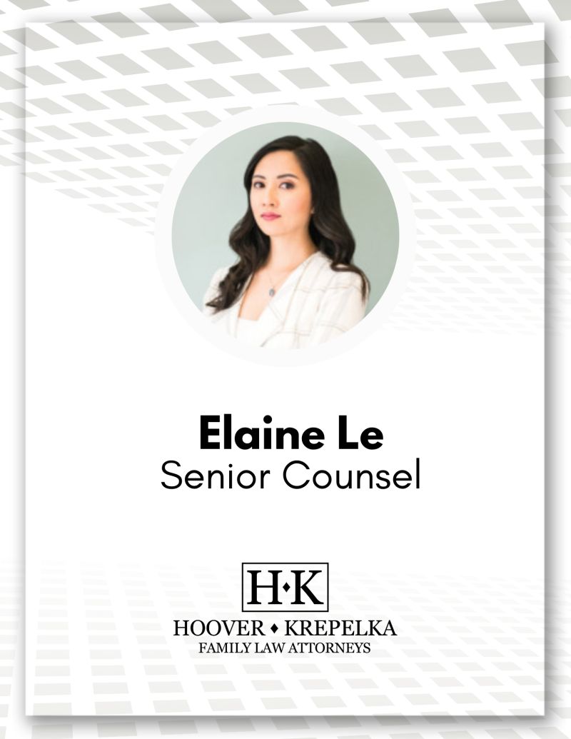 Elaine Le joined Hoover Krepelka in 2020 and has since distinguished herself as a fierce and compassionate family law advocate, known for her integrity and dedication to guiding clients through some of life’s most challenging moments. Before devoting herself fully to family law, Elaine began her legal career in bankruptcy law. She earned her Bachelor of Arts in Psychology with minors in Political Science and Music History from UCLA, followed by her Juris Doctor from the University of La Verne College of Law.