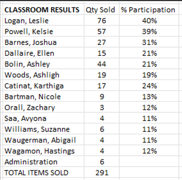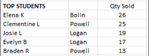 Five students went above and beyond with their sales hustle! A huge shoutout to Elena K, who took first place, and Clementine L, close behind in second.