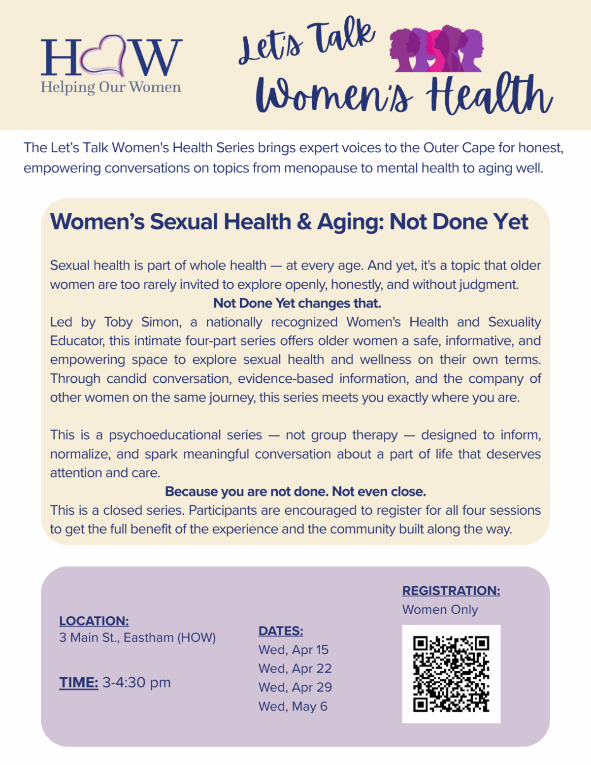 Not Done Yet: Women's Sexual Health & Aging: join this 4-part series of real conversations about intimacy, desire, and sexual wellbeing — with evidence-based information facilitated by an expert sexual health educator.