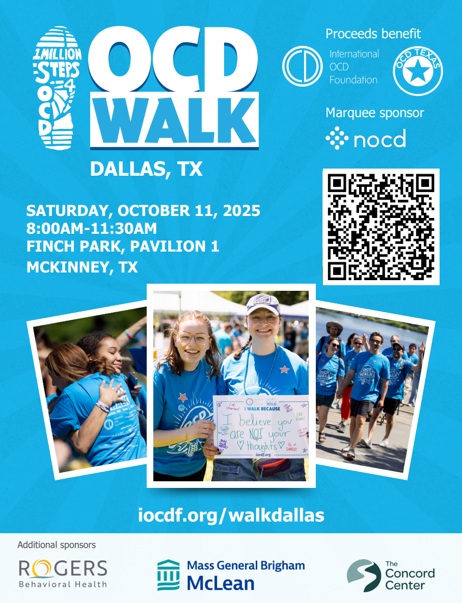 The walk starts at 9 am and is free to attend. Co-hosted by the International OCD Foundation, the One Million Steps for OCD Walk is the nation’s largest grassroots awareness-building and fundraising campaign to highlight obsessive compulsive disorder (OCD) and related disorders, including body dysmorphic disorder (BDD) and hoarding disorder (HD). The OCD Walk aims to reduce the stigma associated with OCD and mental illness in general, and funds raised support the important work of the IOCDF and its partnering Affiliates, including OCD Texas. These programs aim to drive change through advocacy, education, research, and resources that improve the lives of those living with OCD and related disorders. Register HERE.