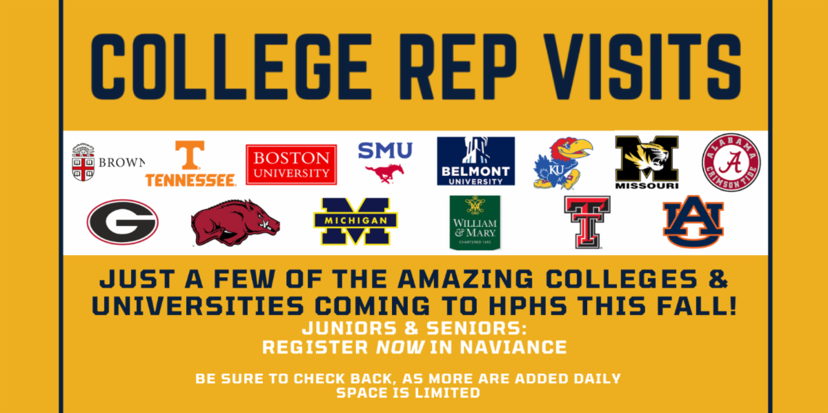 Juniors & Seniors: Colleges continue to add Rep Visits dates to our College Center Calendar! Check it out and register in Naviance!